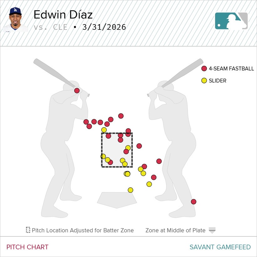 In a non-save outing, Edwin Díaz was not sharp. His outing began with Kyle Manzardo being hit by a pitch, followed by a walk. With one out, Brayan Rocchio produced an RBI single, then the veteran closer bore down, recording consecutive strikeouts, finishing a three-run win over Cleveland. He threw 33 pitches (21 strikes – 63.6 Strike%) and produced three whiffs (9.1 SwStr%).
